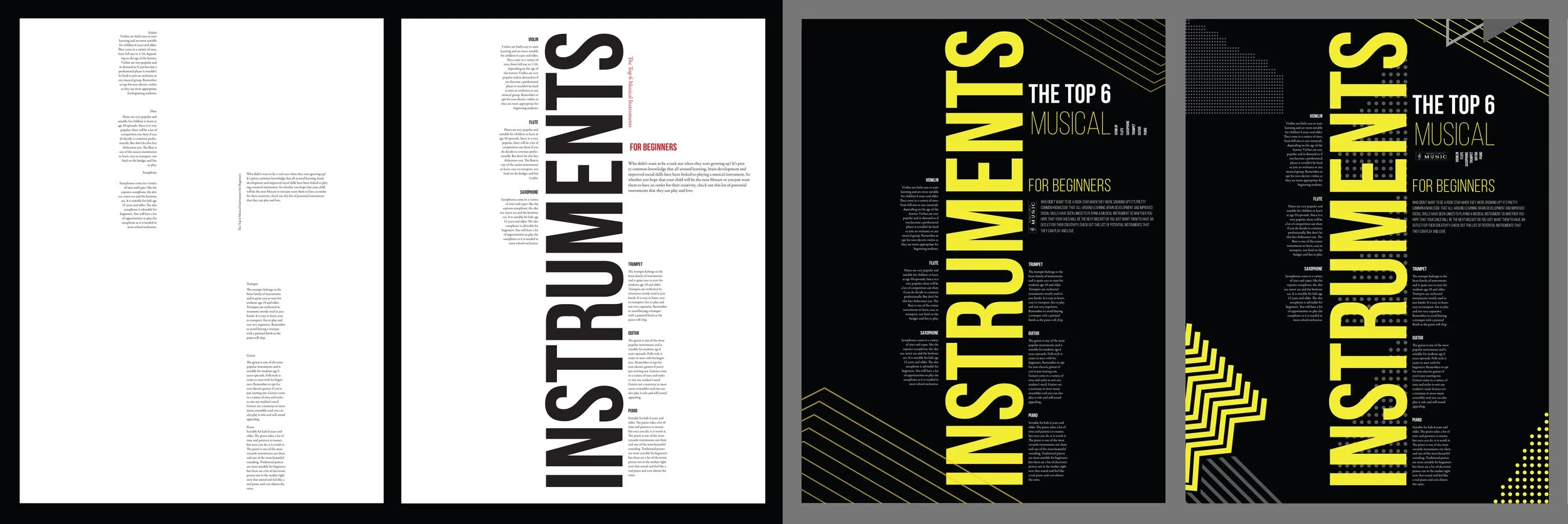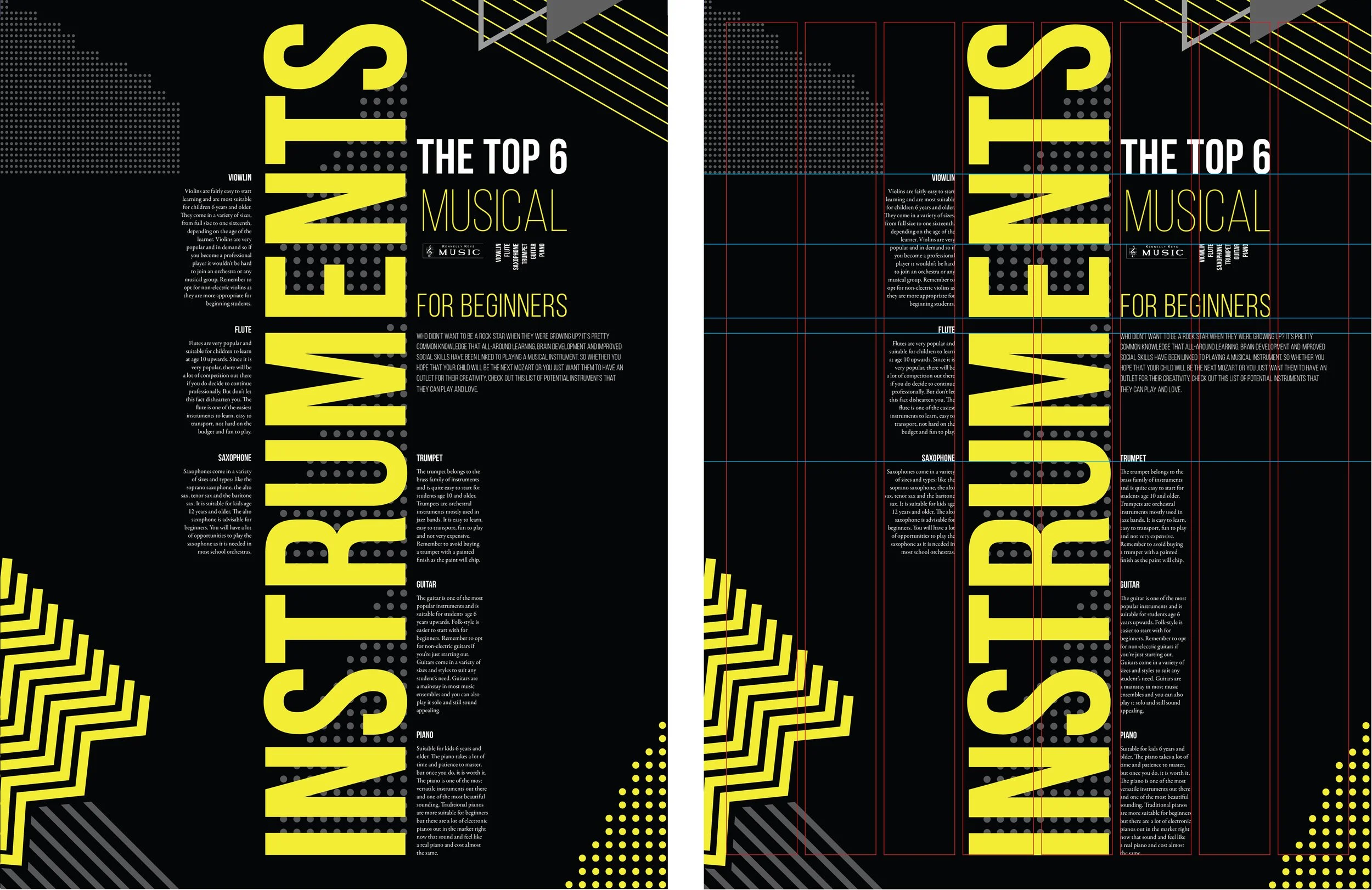 Inspired by the simplicity and clarity, I experimented with a multi-column grid in order to design a 15" x 20" instruments poster. Here are 5 design iterations.